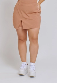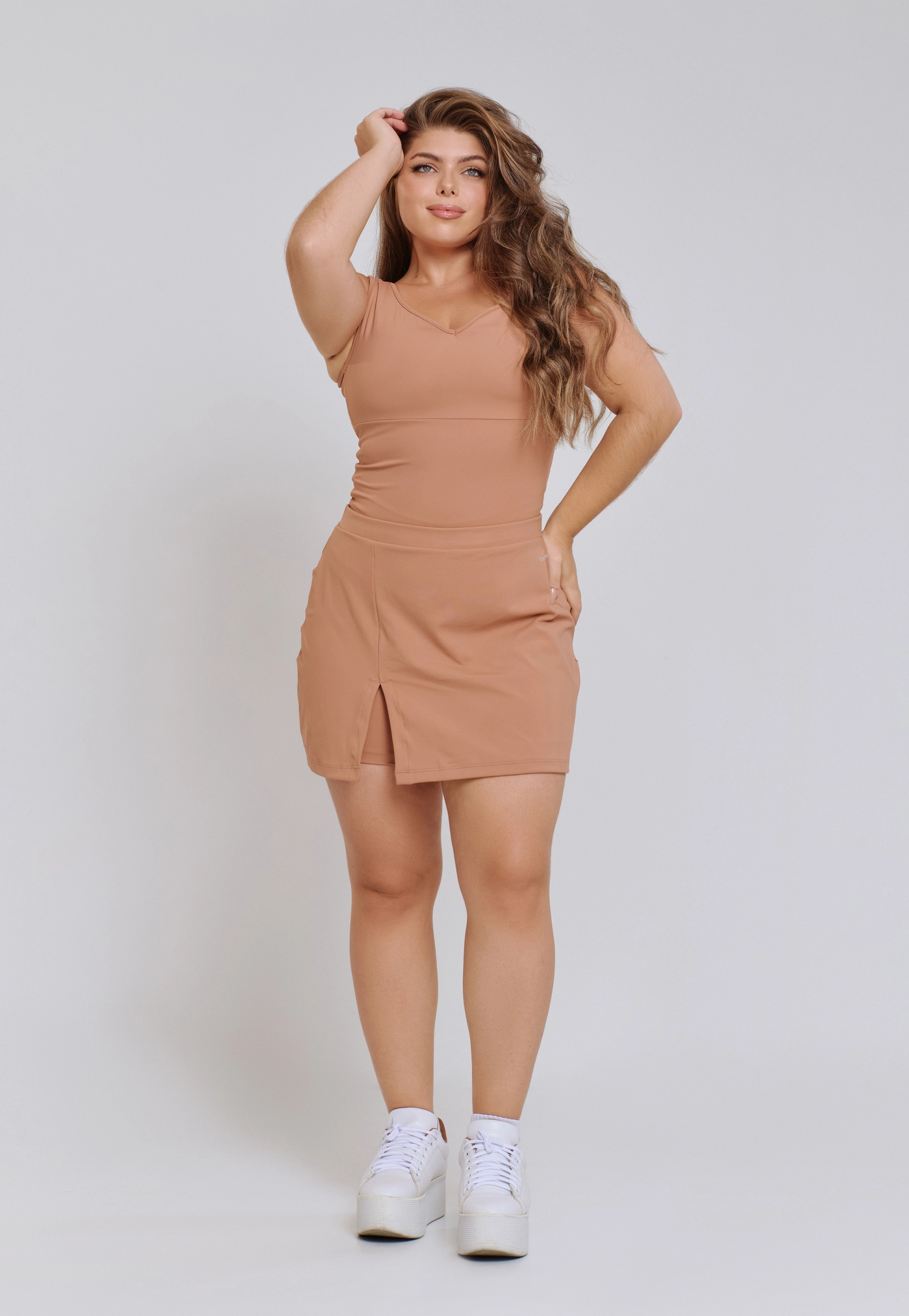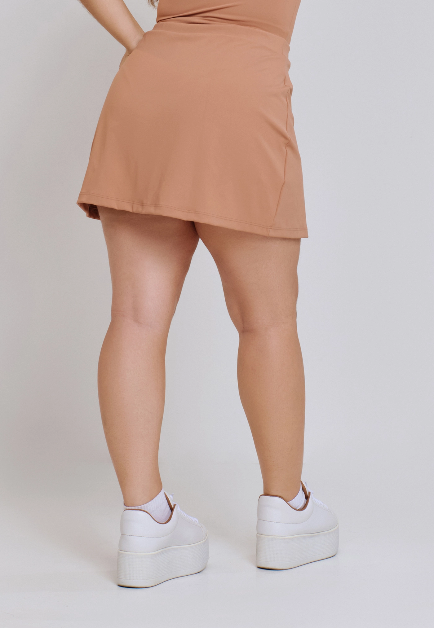 Nosso primeiro short saia em tecido de fio duplo entrega uma estrutura mais firme, que modela o corpo e garante maior sustentação. Por ter uma modelagem mais ajustada ao corpo, é uma peça versátil que transita com facilidade do treino ao dia a dia — inclusive em produções mais sociais.