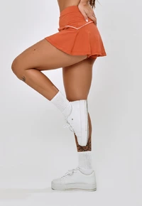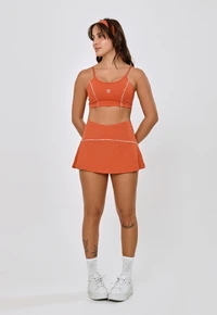 Nossa saia curta possui cós anatômico, aliado a um elástico cuidadosamente integrado, proporciona um ajuste perfeito, leve e fluido, com vivo lateral, trazendo uma estética tenista e sofisticada.